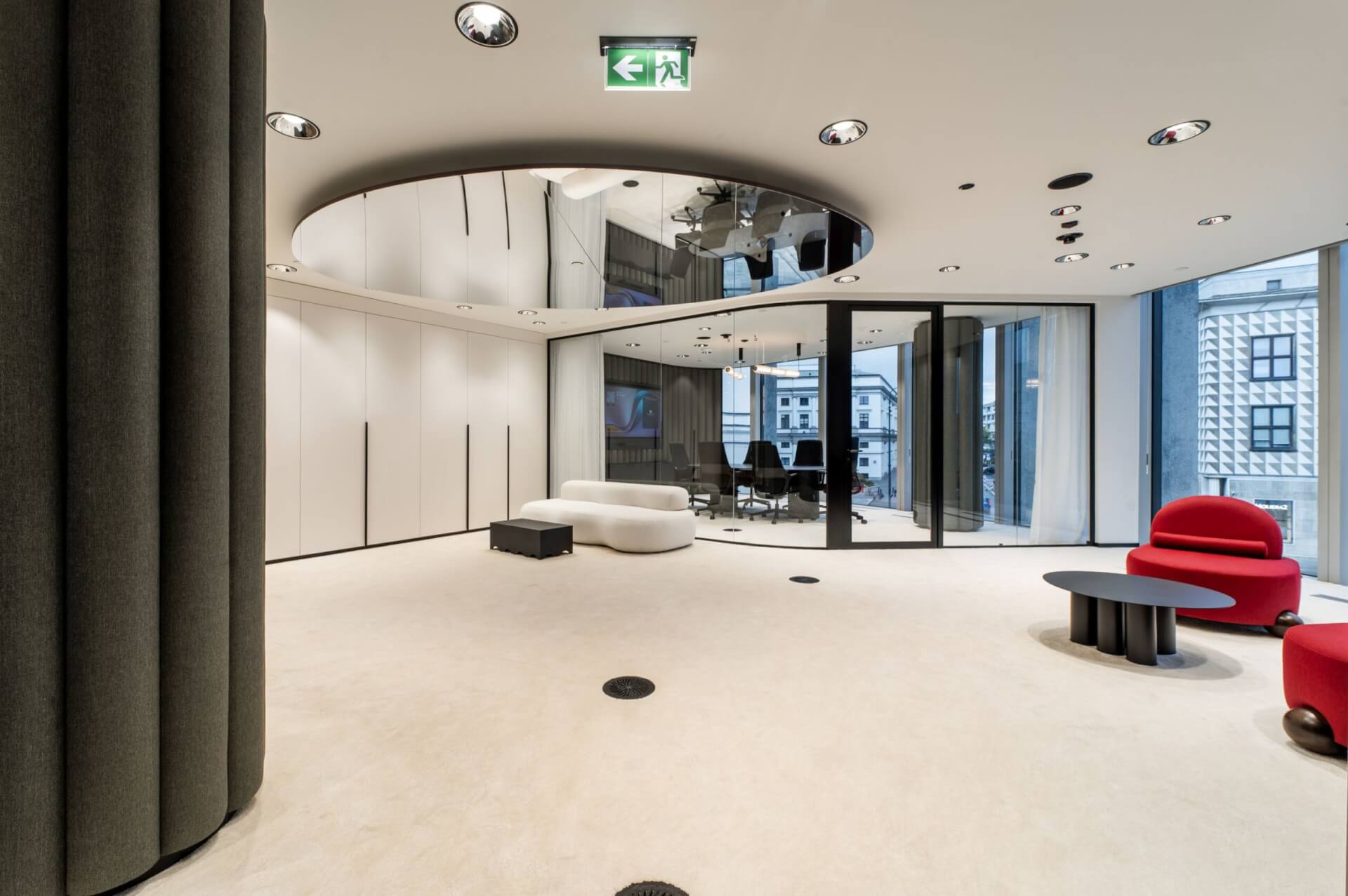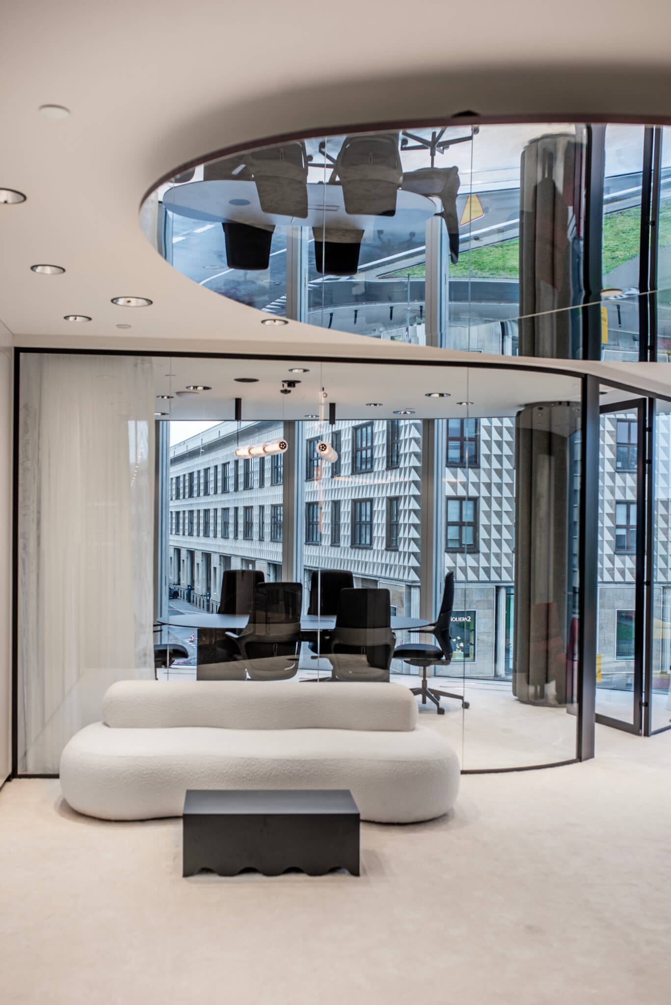Zur Raumgliederung kamen unser Glaswandsystem GSW Office sowie die Türen Urban Slim zum Einsatz. Sie verleihen der Fläche Leichtigkeit, begünstigen den natürlichen Lichteinfall und unterstreichen den minimalistischen Charakter des Interieurs. Die im Bogen geführten Wände harmonieren dabei perfekt mit den abgerundeten Ausstattungselementen und den Designermöbeln.