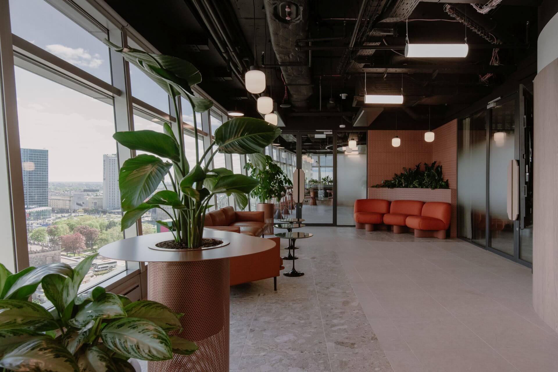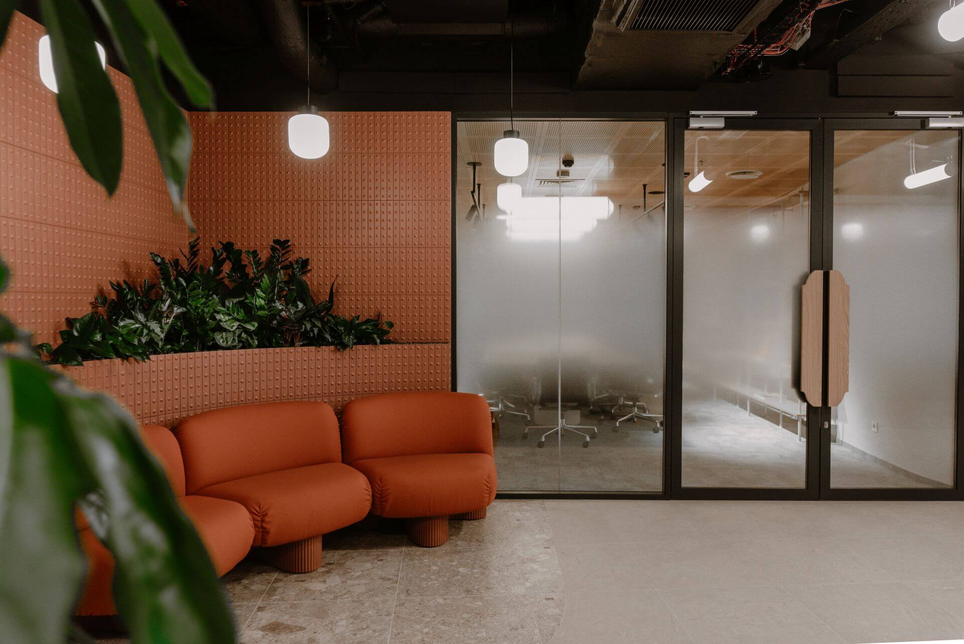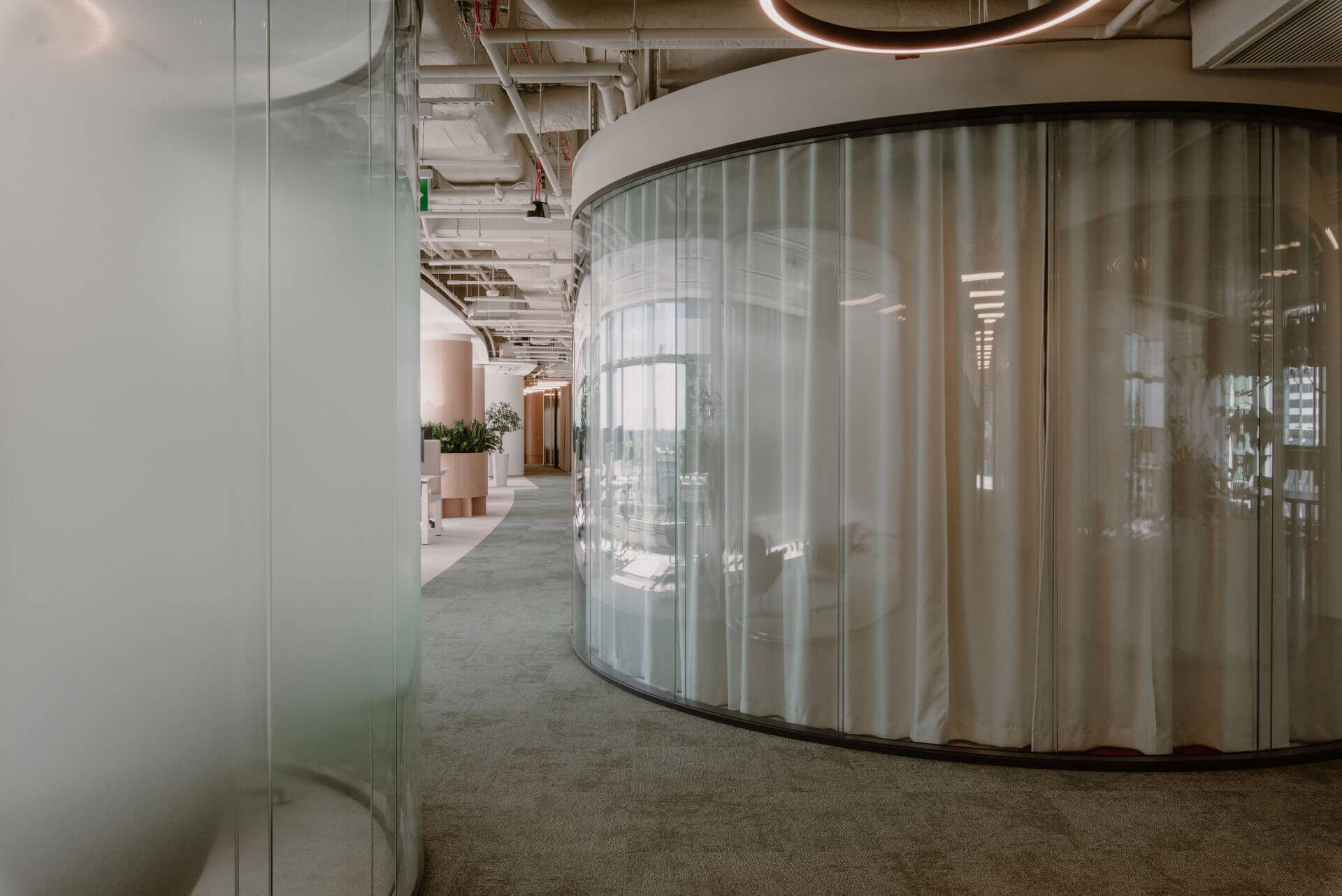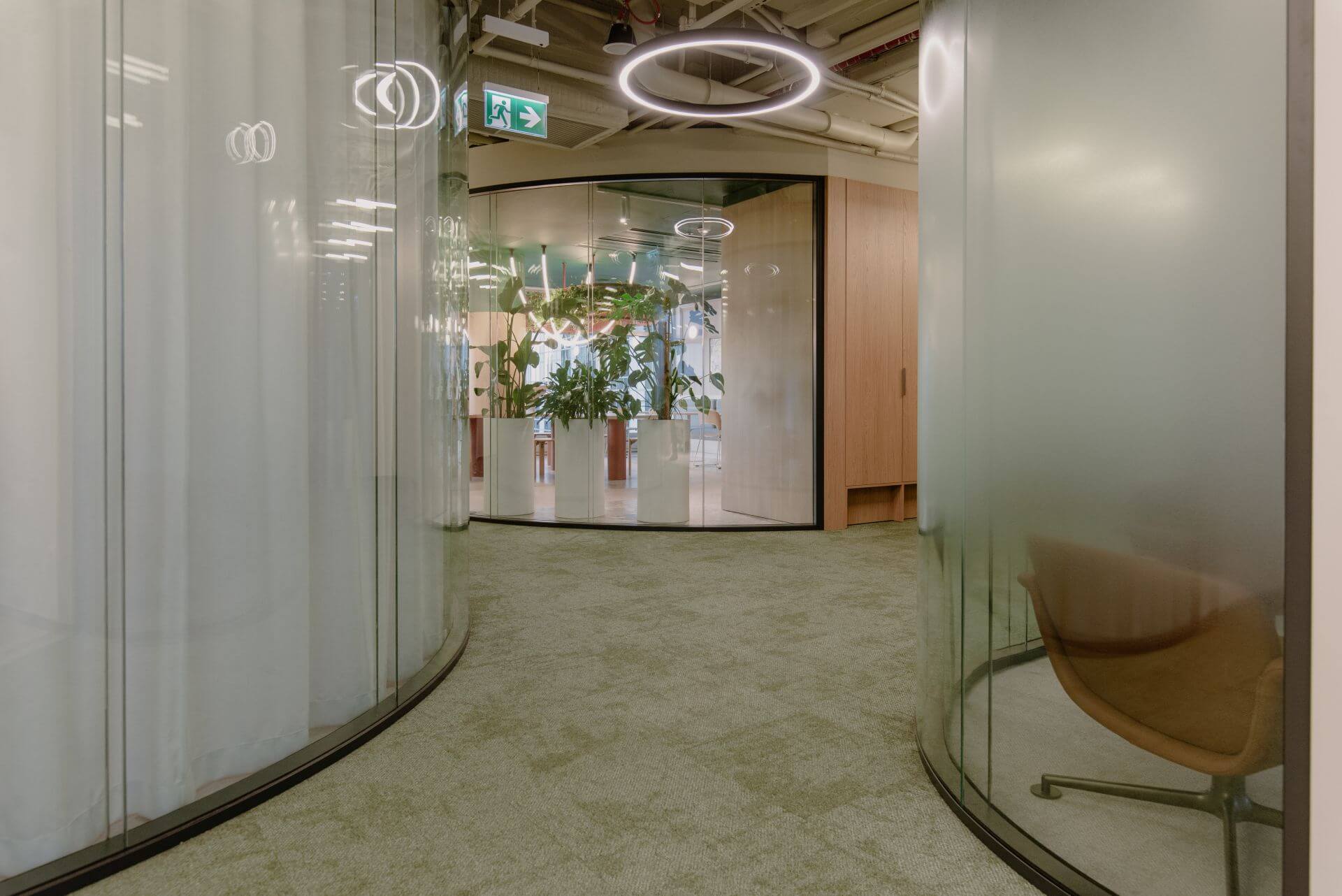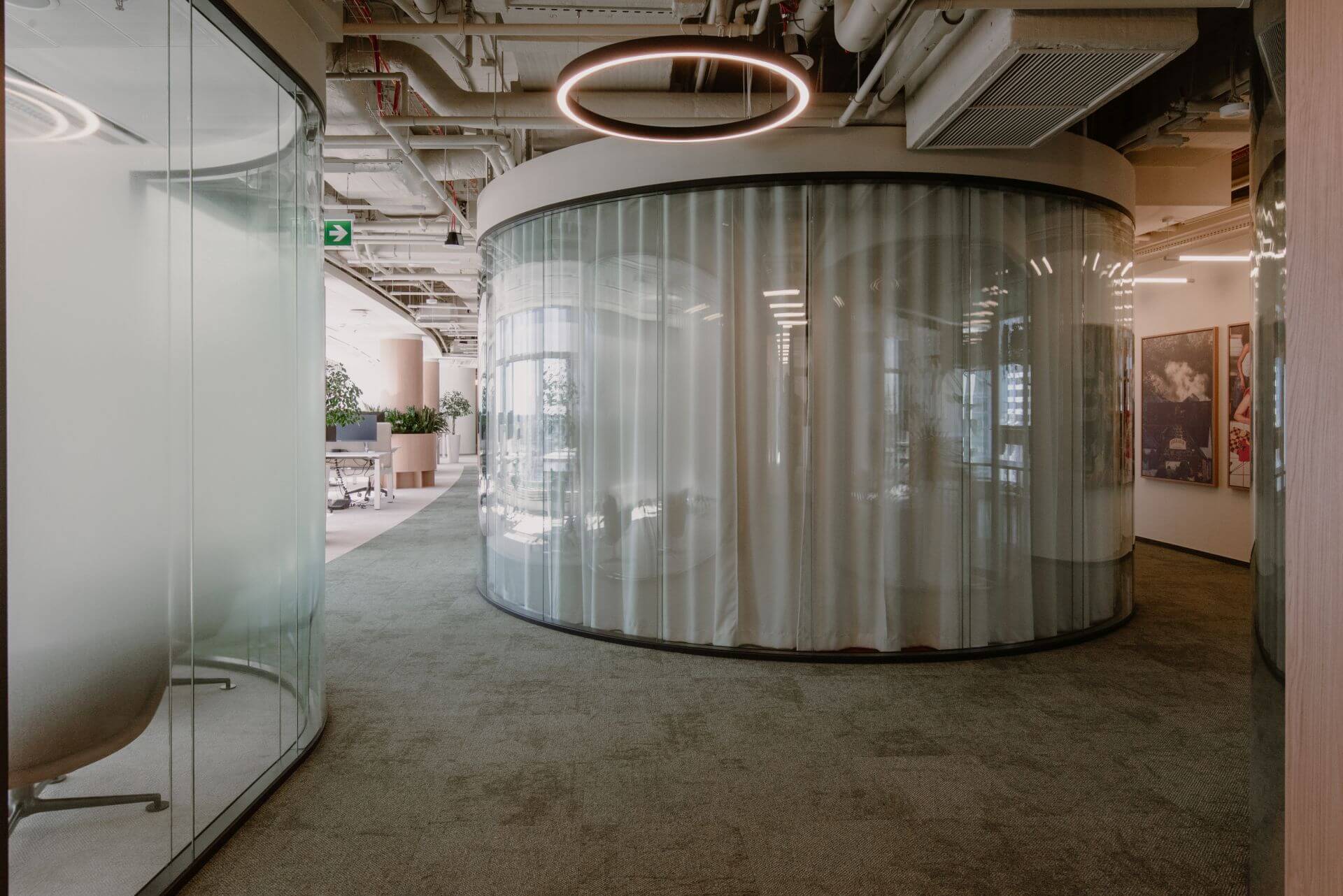 Our GSW Office Plus double-glazed system, Urban Plus and Timber doors helped bring this vision to life. The curved glass walls here deserve special attention, as they perfectly highlight the dynamic aesthetic. By breaking the standard geometry, they lend the interior a sense of lightness and originality and enable the flow of natural light.