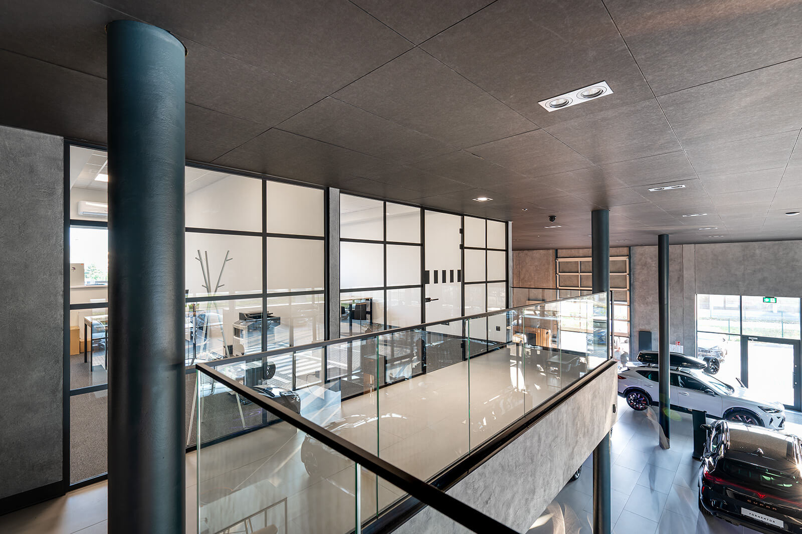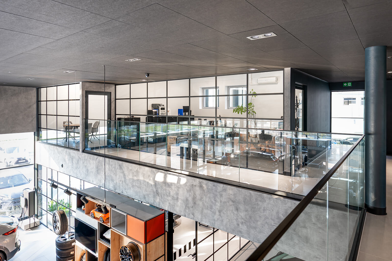 Aby idealnie oddać odważnego i nowoczesnego ducha marki, postawiono tu na szprosowe ściany GSW Office i drzwi szklane. Dzięki nim ta dwupoziomowa przestrzeń zyskała industrialny charakter, jest doskonale doświetlona, a jednocześnie podzielona na funkcjonalne strefy: ekspozycyjną, biurową i lounge.